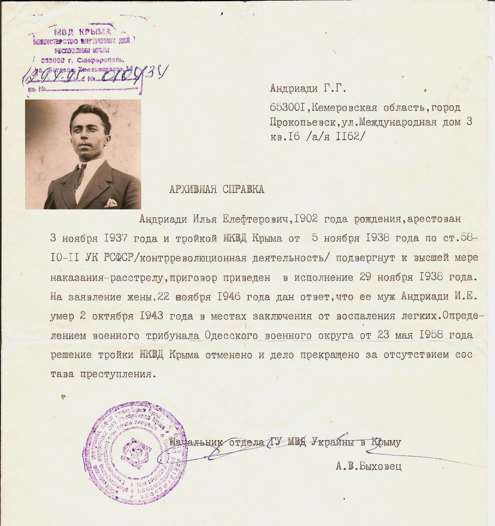 Андриади Г.Г.;-жена и дочери -Андриади С.И.; Андриади Р.И." Андриади М.И. |